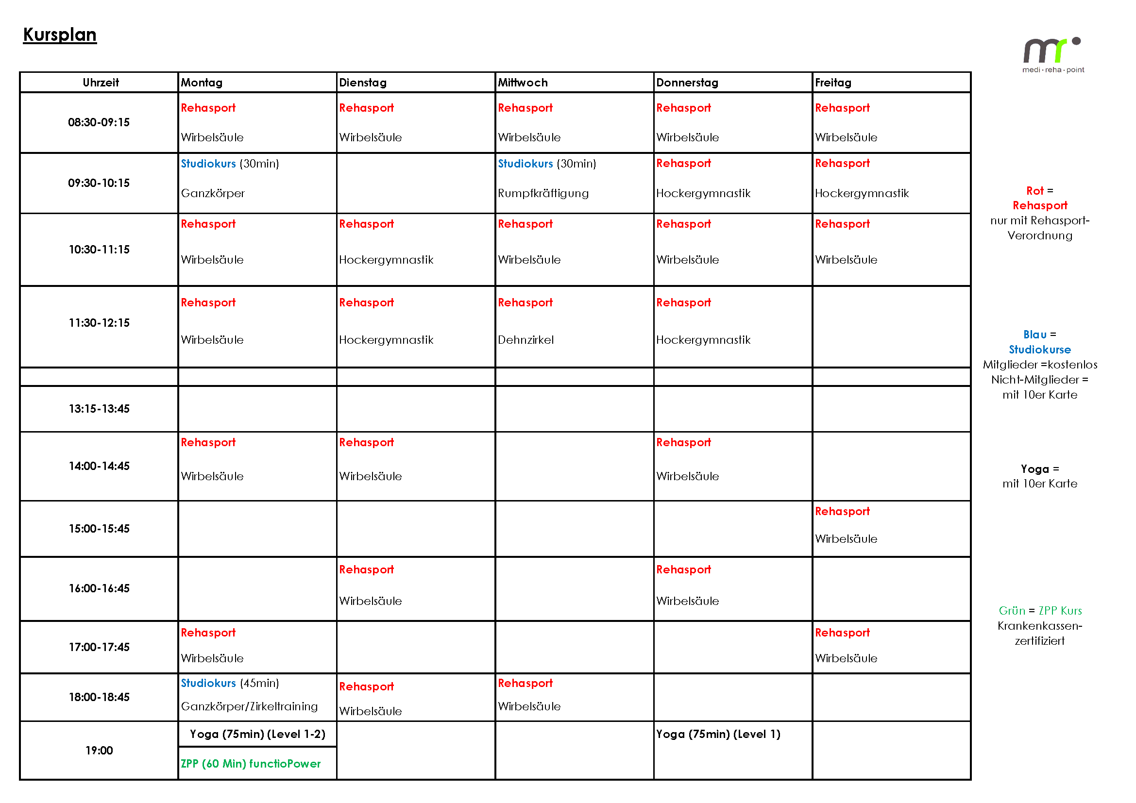 Eintragungen durch Mitarbeiter des medi-reha-points sind leider nicht möglich! Bitte melden Sie sich immer ab, falls Sie Ihren Kurs nicht wahrnehmen können – Sie erreichen uns von Montag bis Freitag zwischen 8:00 Uhr und 20:00 Uhr, bzw. über unseren Anrufbeantworter.